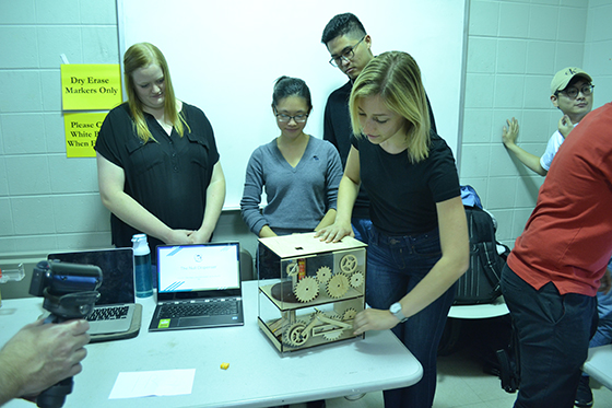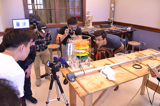 Professors Alison Dunn and Seok Kim led the fall semester’s team projects, for which the primary goal was to use design knowledge to build marble machines. Each device was required to reliably transport 10 large ball bearings (1” diameter) in a circuit, with extra points for creativity, fast or slow circuit times, and directing the balls into multiple different downward paths. Dunn said the teams did very well, using many different mechanisms and themes.