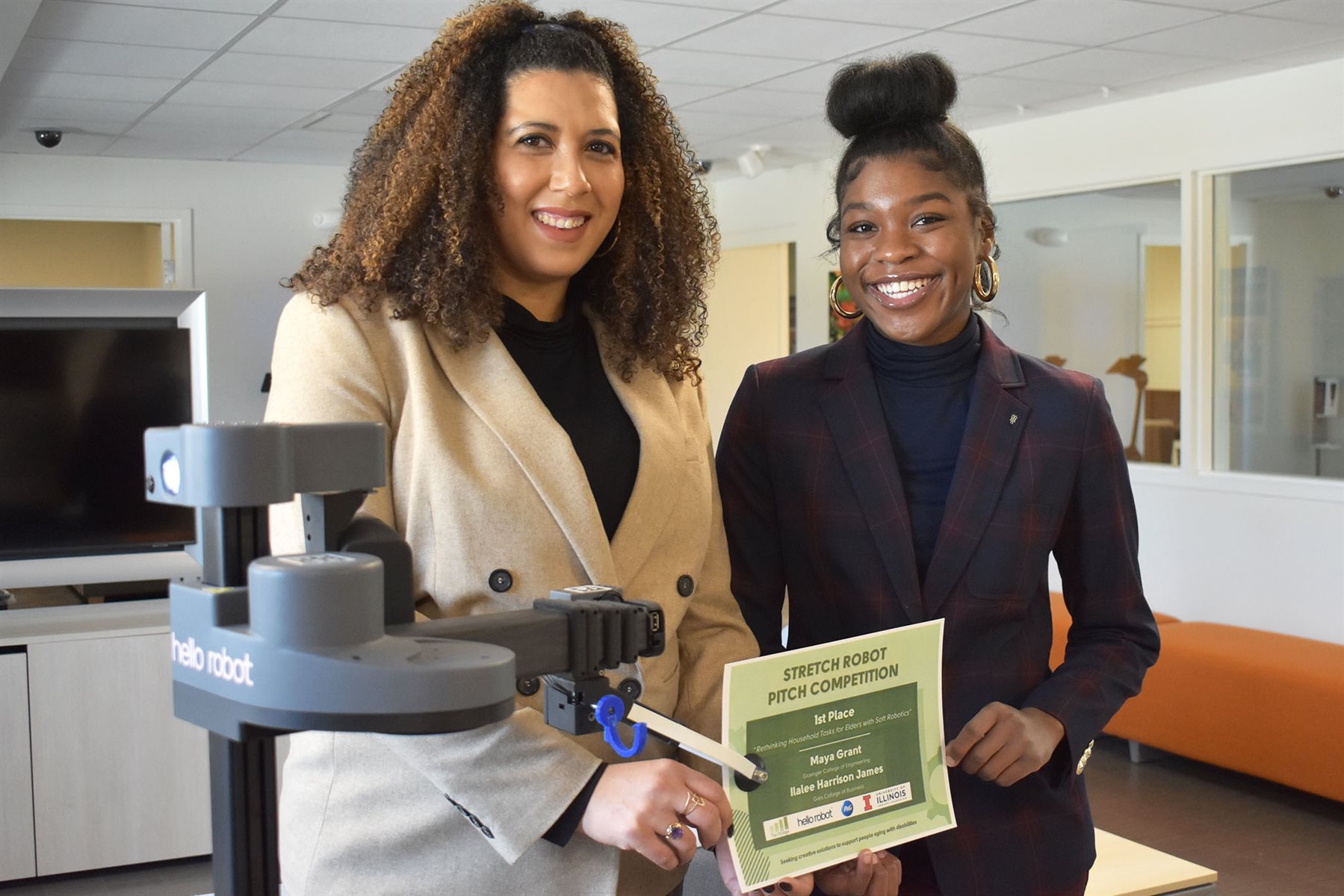 MechSE sophomore Maya Grant teamed with Gies graduate student Ilalee Harrison James to win first place in the Stretch Robot Pitch Competition.