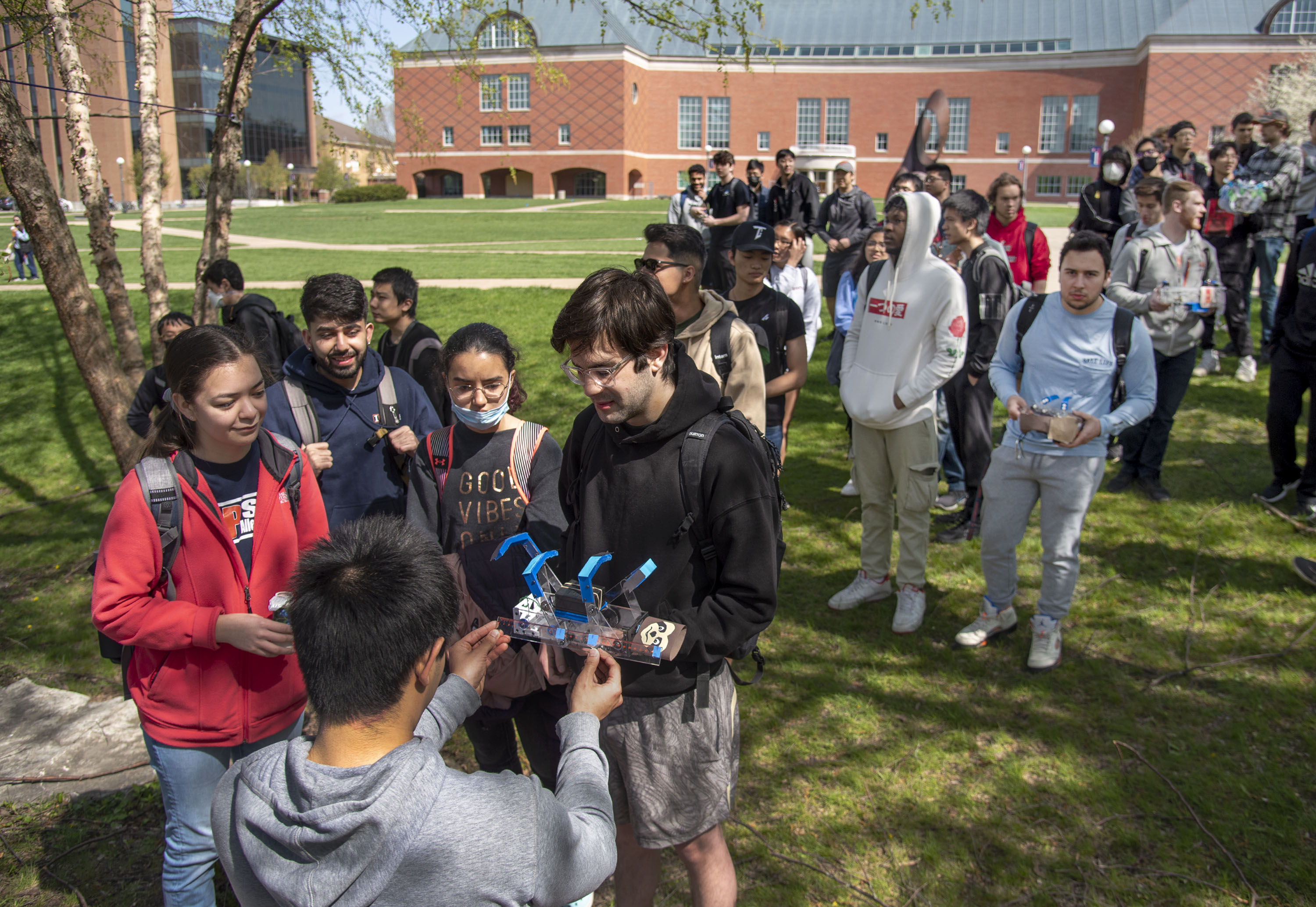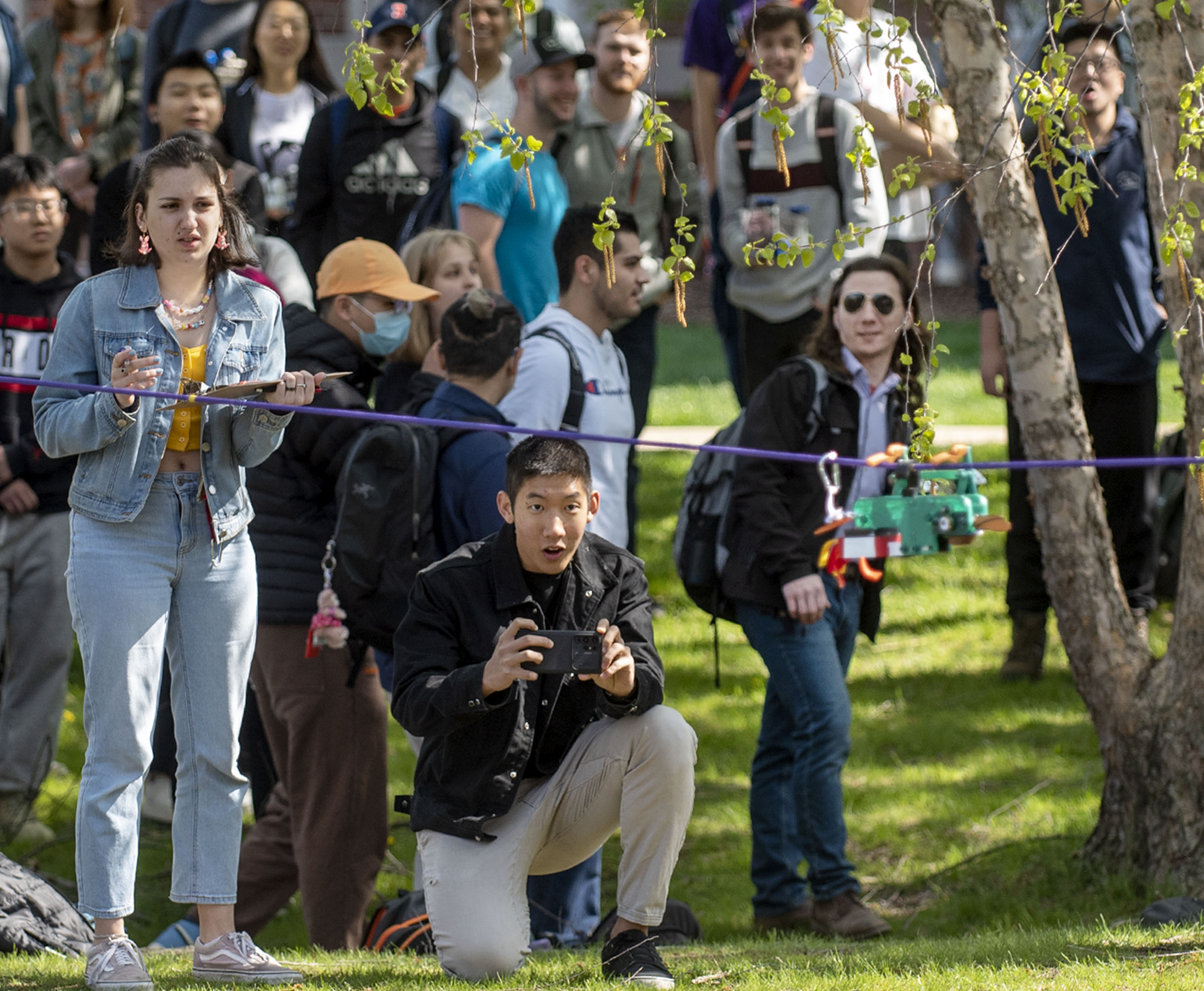 Undergraduate students in Mechanical Design I (ME370) bring their "cable walkers" to life as they race them across Boneyard Creek on Bardeen Quad on Monday, May 2, 2022. The project criteria included measuring speed, distance, aesthetics, size constraints and budget. The class is taught by MechSE faculty members Sameh Tawfick and Arend van Zande. Photos by Heather Coit, The Grainger College of Engineering.