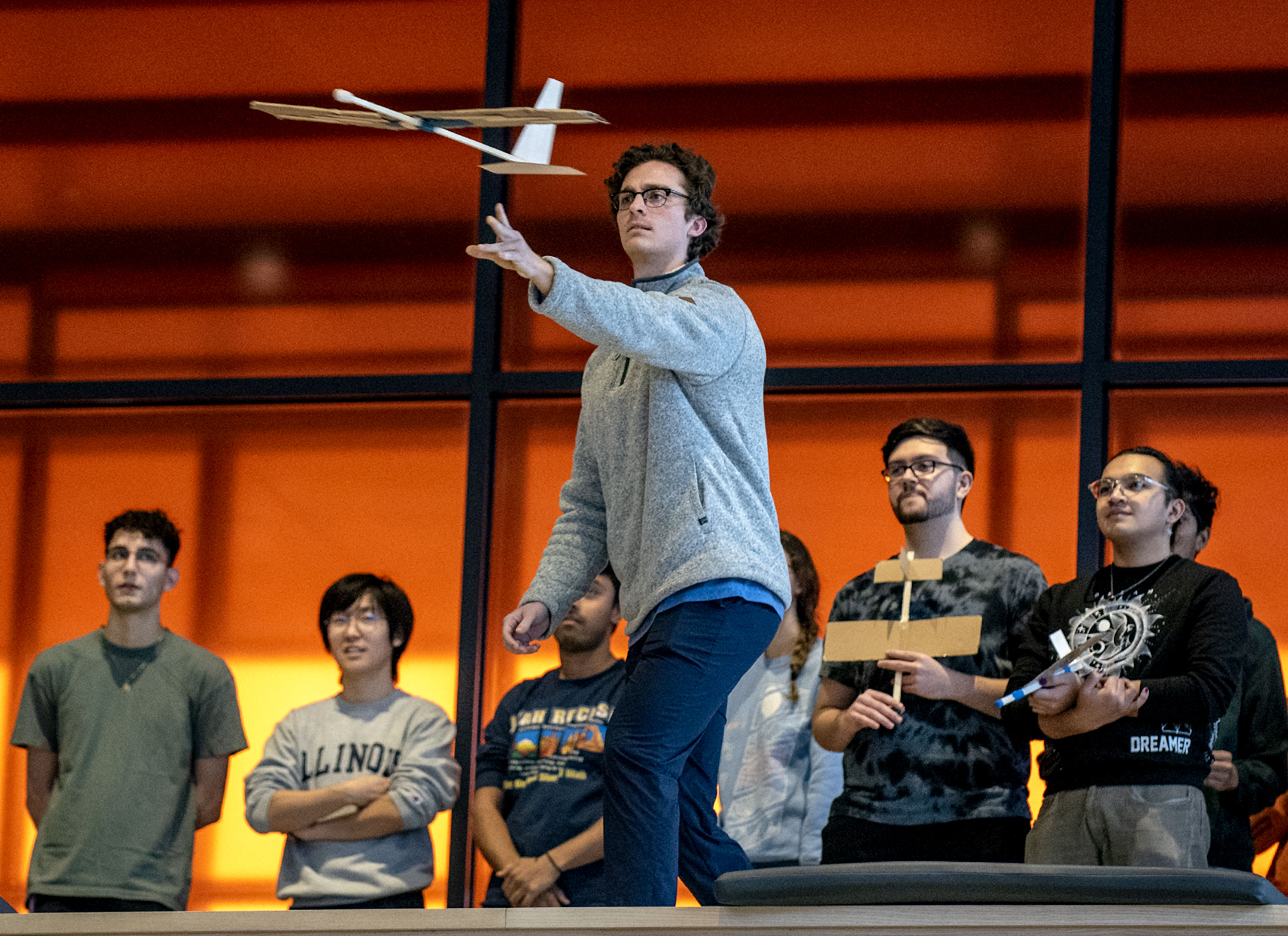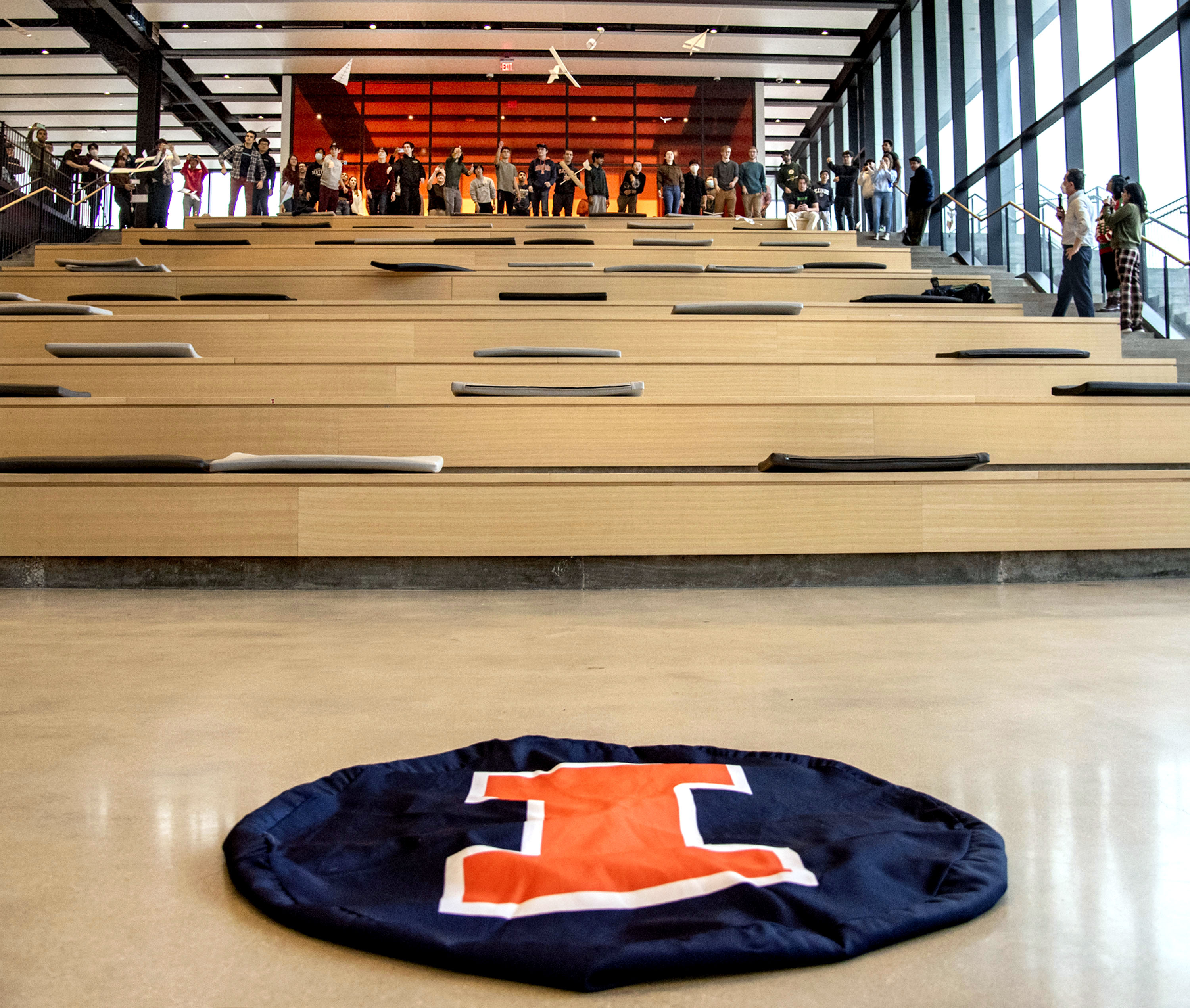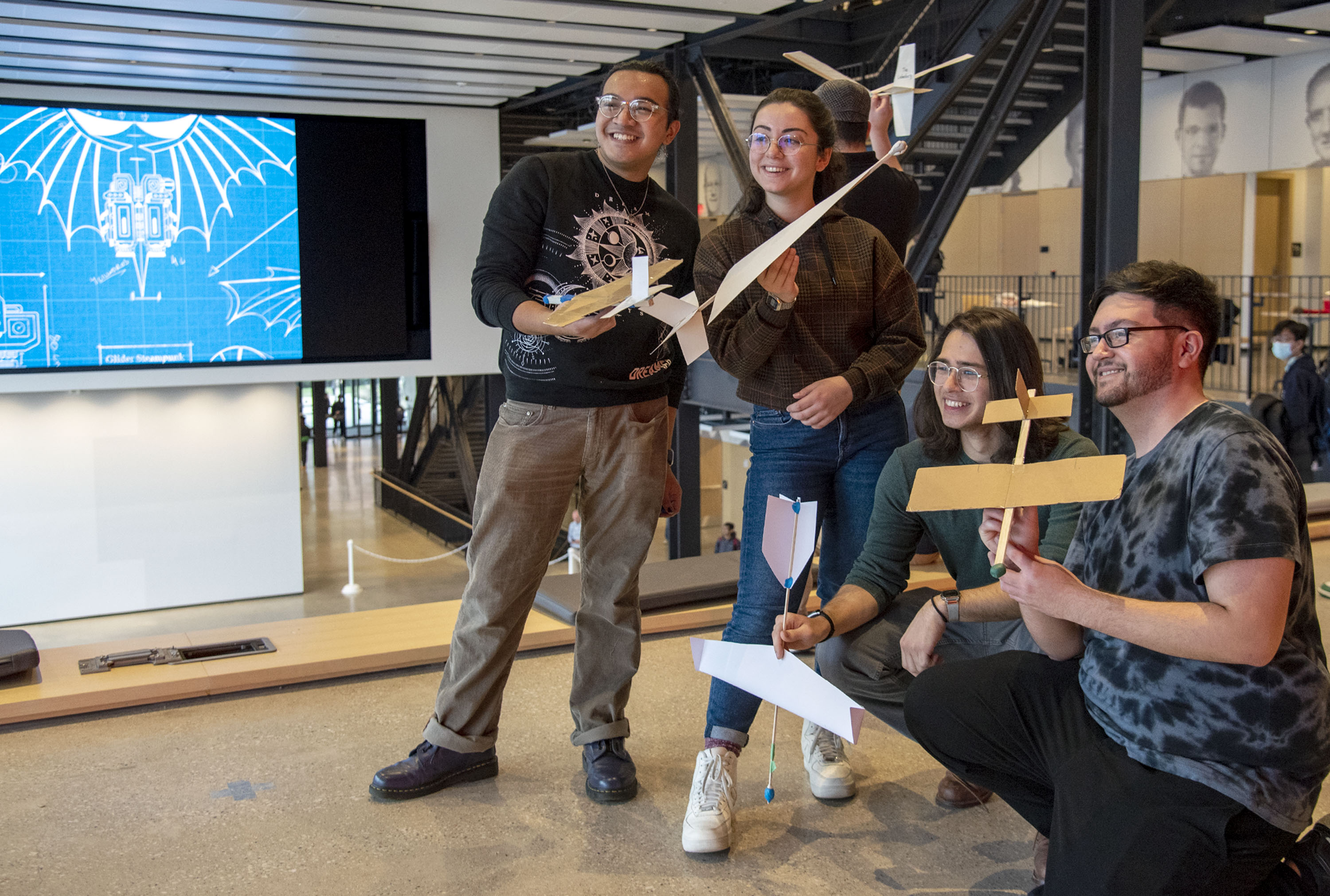 Teams had to design a glider that would advance 21 meters while descending 8 meters to hit a 1-meter-diameter target. They had a $0 budget and had to make use of found or recycled material where possible. A class competition showcasing these low-fidelity prototypes was staged at the Monumental Steps in the Campus Instructional Facility. Each team had two opportunities to show what their gliders could do.