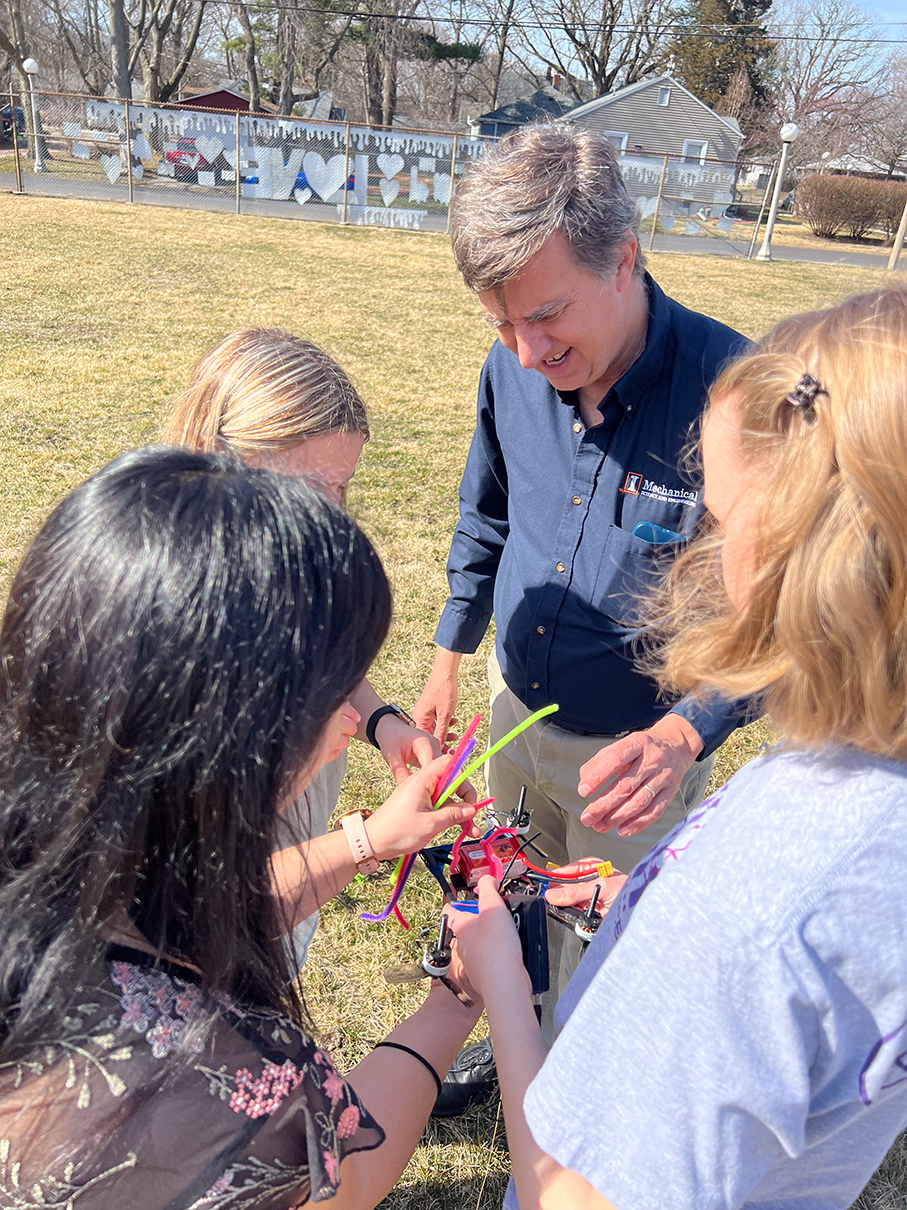 Hovakimyan, Muskin and mechanical engineering graduate students led the middle schoolers in designing their drone frame using CAD software, 3D printing in MechSE’s Jackson Innovation Studio, then building their design idea, adding motors and controllers. Monday’s event at the school in Urbana was the first time the student teams tested their creations.