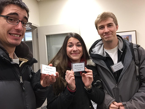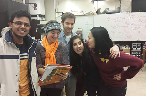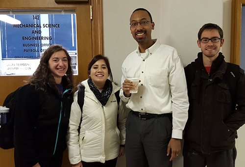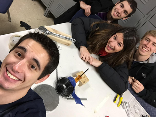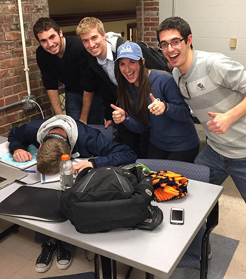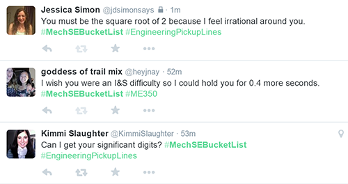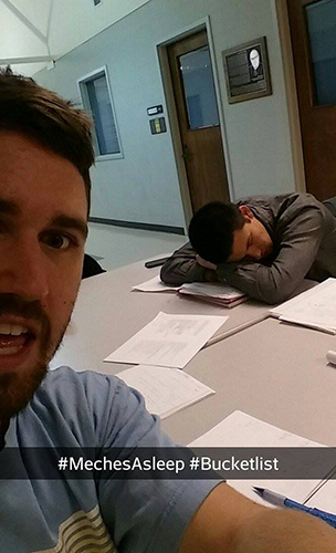 Some of the Bucket List activities included: Create and perform a MechSE Song (5 points); Open the Puzzle Case (5 points); Take a group picture (at 4am? 3am? LATE) at MEL with time stamp (3 points); Selfies with professors (3 points); Get lunch with a professor (5 points); Build a simple machine (not for a class) (3 points); Build a MechSE snowman (3 points); Tweet your best MechSE pick-up line (1 point); Find a #MechSE asleep (3 points); Get to class using a Rube Goldberg contraption (i.e. get to class in a weird way) (5 points).