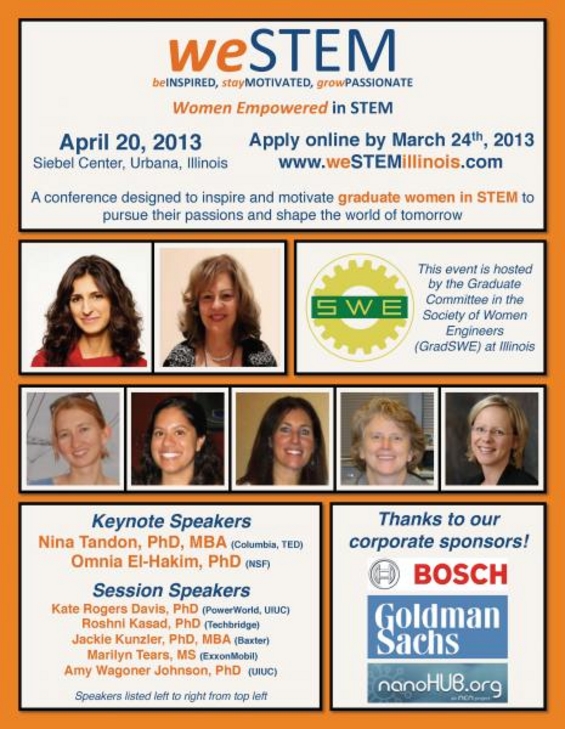 Registration is limited. Approximately 50 attendees will be chosen from an applicant pool to attend the weSTEM conference. To apply, complete and submit the form available here by Sunday, March 24, 2013. After acceptance to attend, confirmed participants will be charged a $10 registration fee. Applications are open to graduate students in all STEM programs at Illinois. For more information, visit http://westemillinois.com/ or contact weSTEM Publicity Coordinator, Ritu Raman, at rraman9[figure="" class="align-center" width="10"]illinois [dot] edu.
