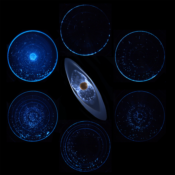 "Bioluminescent Galaxy": These are not the Hubble generated images of galaxies in distant universe. In fact, these are the images of bioluminescent microscopic marine organisms, ‘dinoflagellata’ (Pyrocystis fusiformis), from very simple lab experiments captured using a DSLR camera. A single organism is shown in the center image, length ~ 700μm. Dinoflagellata are unicellular organisms that respond to mechanical disturbances in their surroundings by emitting visible light almost instantaneously. They are the most common source of bioluminescence in the sea at night, and well-known locations to observe them include Puerto Rico, Jamaica, and New Zealand. We characterize this behavior by exposing populations of cells to hydrodynamic forces in a ‘rheometer’, shown in the circular images (circle diameters 40 mm). Cells in a pool of seawater are placed on a surface-treated (silanized) glass plate which promotes cell adhesion. An aluminum disk is placed a fixed distance from the glass surface and rotated to create a flow field. The sequence of images shown are captured at different angular velocities of the aluminum disk. At higher velocities, cells are exposed to higher hydrodynamic stresses, and hence emit higher intensity of light. The blue streaks in the images are path lines followed by individual organisms.