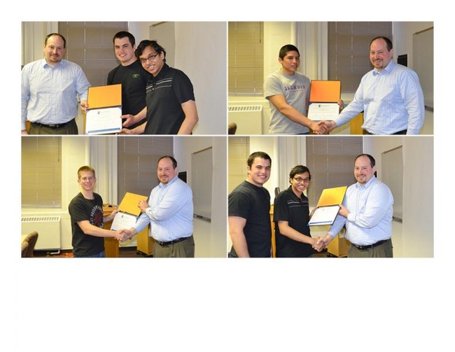 At the 2013 Engineering Open House, the MechSE Department again had great exhibits on display in Mechanical Engineering Laboratory, Talbot Laboratory, and out on the Bardeen Quad. At the departmental EOH awards luncheon on April 22, the 1st-place award for best exhibit went to the American Society of Mechanical Engineers (ASME), 2nd place went to Pi Tau Sigma Mechanical Engineering Honors Society (PTS), and tied for 3rd place were the Society for Experimental Mechanics (SEM) and Society of Automotive Engineers (SAE). The EOH Documentation Award went to the American Society of Mechanical Engineers (ASME).