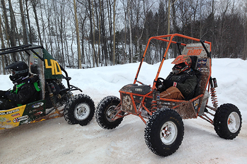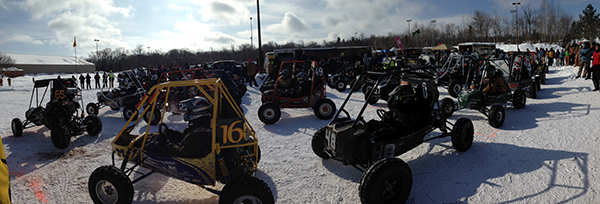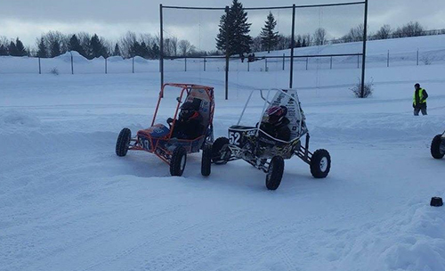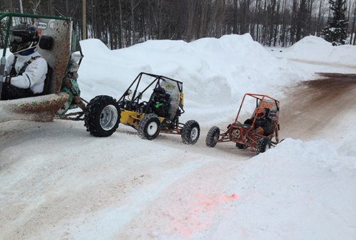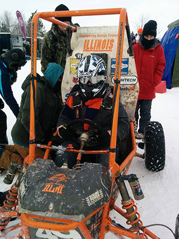 Over a weekend in late February, MechSE’s Society of Automotive Engineers (SAE) Baja team traveled to Houghton, Michigan, for Michigan Tech’s annual Blizzard Baja. This friendly unofficial competition offers teams the chance to get together outside of official competition and have fun driving their vehicles on the snow and ice. About 25 schools participated. MechSE’s Baja team for the event consisted entirely of undergrads, including: Mike Bardell, Aisha Benidettino, Mason Blake, Gail Butler, Tyler Ditman, Dylan Futrell, Joe Kraemer, Matt Nilles, Chris Nobre, Dustin Schrieber, and Andrew Vahling.