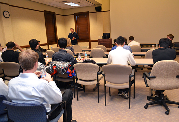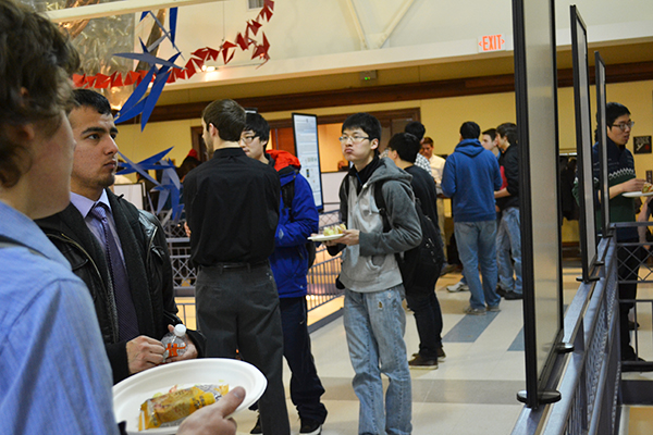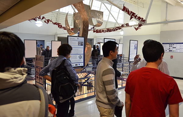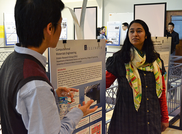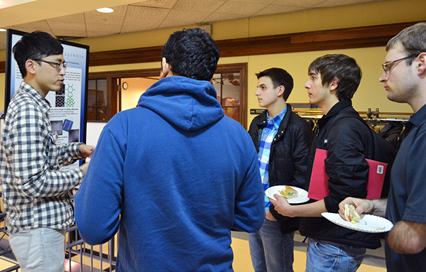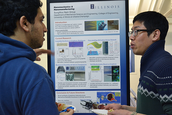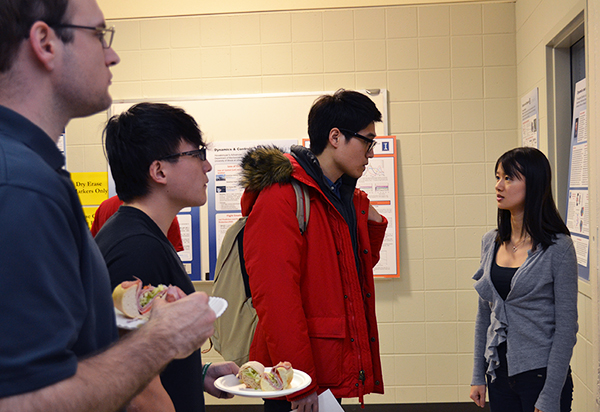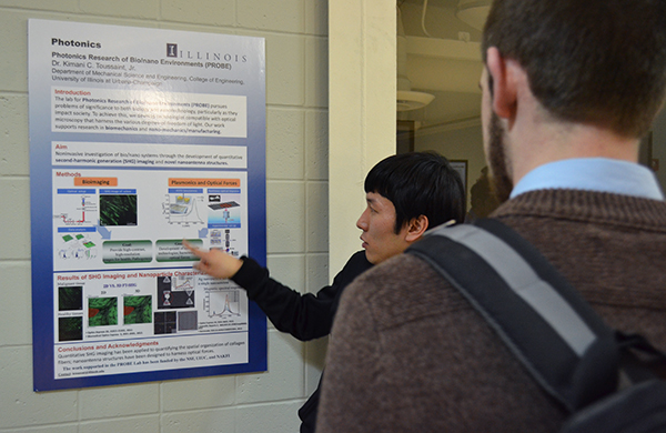 The SEM Undergraduate Research Fair, hosted by MechSE and the Society for Experimental Mechanics, drew a crowd of about 100 to Mechanical Engineering Lab the evening of March 12. The fair gave undergrads the chance to discuss available research opportunities with faculty. Professor Ken Christensen, Associate Head for Undergraduate Programs for MechSE, provided a brief presentation before students walked around to view the research group posters and chat with faculty about their research groups.