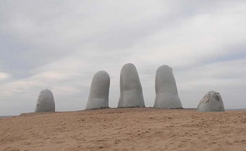One of the most iconic pieces of sculpture in Uruguay is Mano de Punta Del Este, five giant fingertips emerging from the sand at Brava Beach. Completed in only six days by Chilean artist Mario Irarrázabal in February of 1982 during an international sculpture invitation, it represents man coming to life on Earth. On Playa Brava, the sculpture is the only one to survive stinging sun, wiping winds, and grinding sands. From a distance it has a living, moving quality. I suppose the image is familiar—a hand made large and suddenly obvious. I like it.