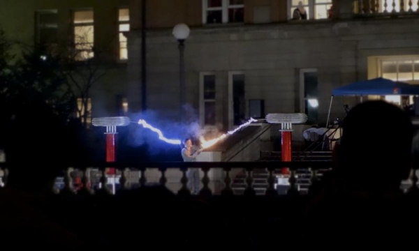And if all this wasn’t enough, there was also the Tesla Coil concert on the night of Friday the 13th. There were two coils side by side that could discharge into the air or onto each other, depending on the strength of the electricity going through them. As each song played, the two coils played the melody line. You could literally see the notes being played because each sound came with discharges of electricity. The idea behind playing music throughthe coils is that the electricity in each has a specific frequency, which corresponds to a wavelength. By adjusting the frequency to be higher or lower, you can change the wavelength of the current and ultimately change the pitch of the “lightning” coming out of the coils. The end result is that you get a buzzing, electric note, and by giving each coil a different frequency, you can have two harmonizing notes.