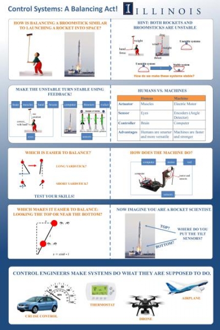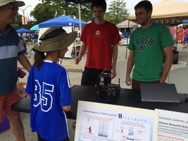 Over several weekends in August at Urbana’s Market at the Square, members of MechSE Professor Andrew Alleyne’s research group, including Ashley Armstrong, Bryan Keating, and Spencer Kieffer, employed yardsticks and an inverted-pendulum balancing robot to challenge Urbana-Champaign residents' balancing skills and knowledge of sensing, control systems, and dynamics.